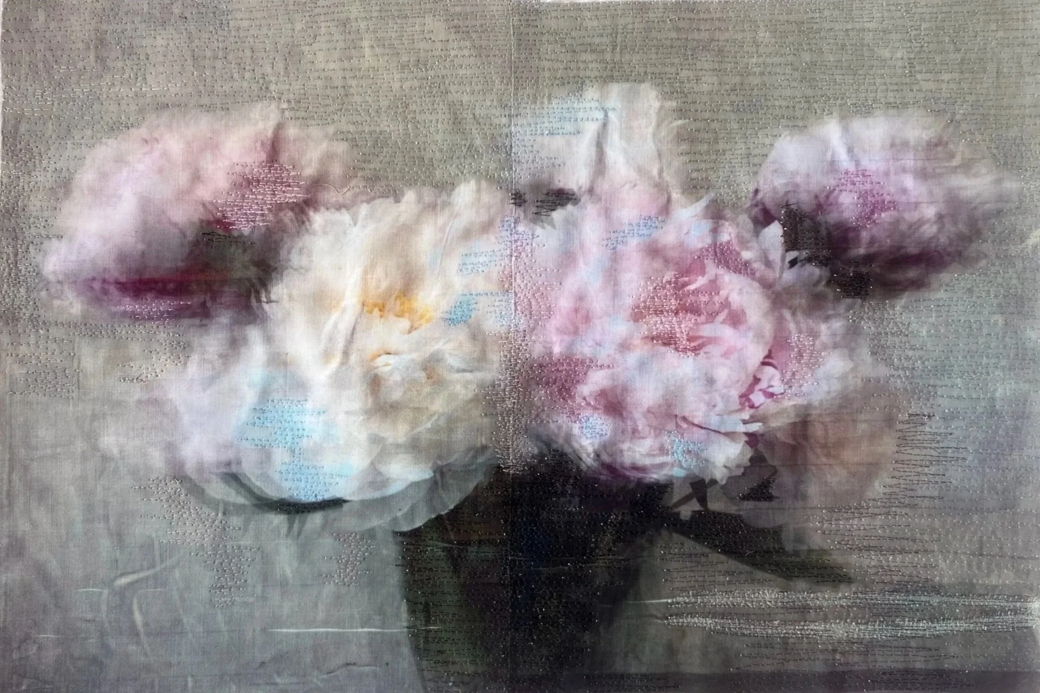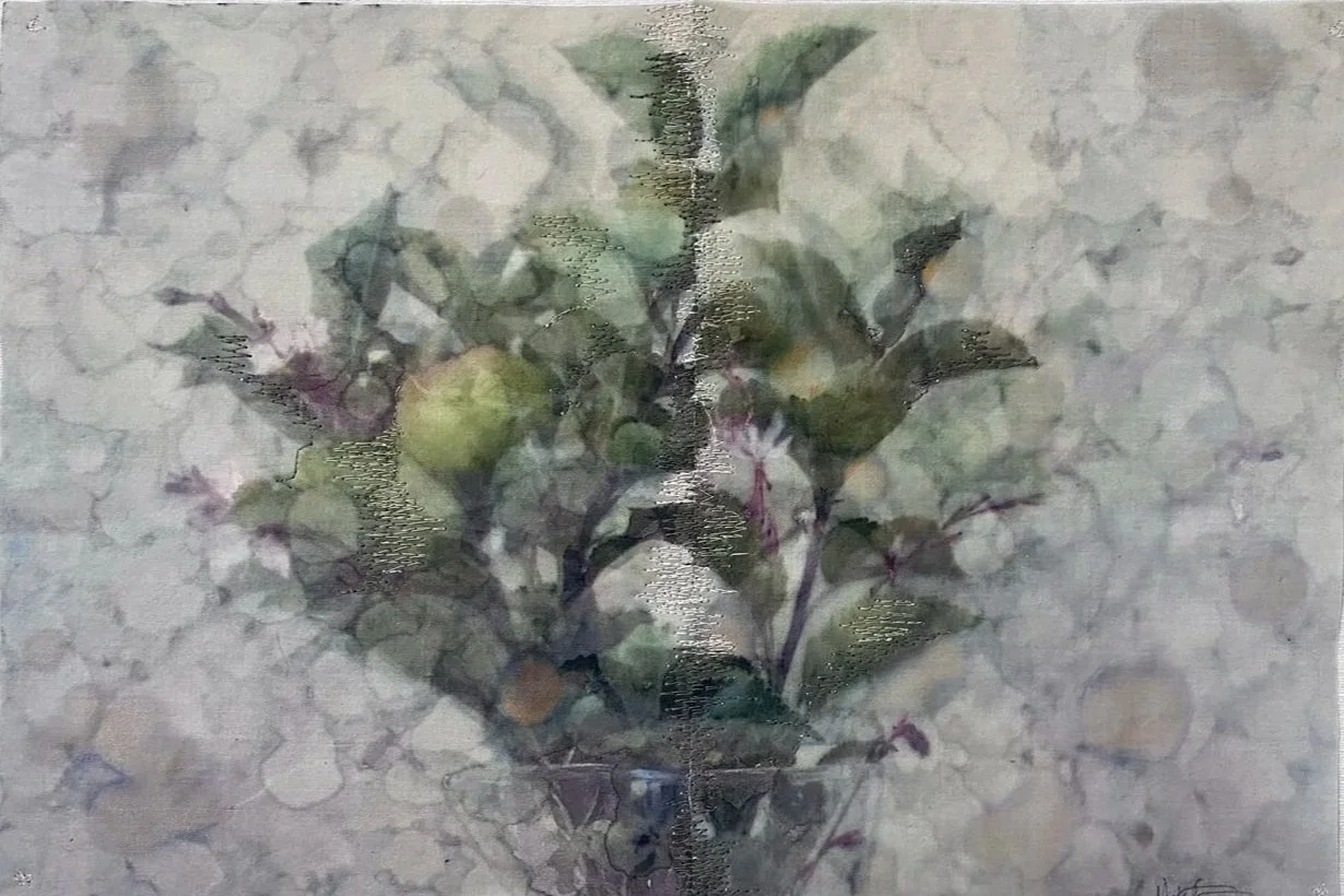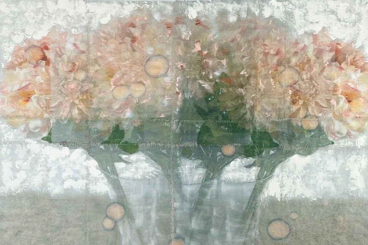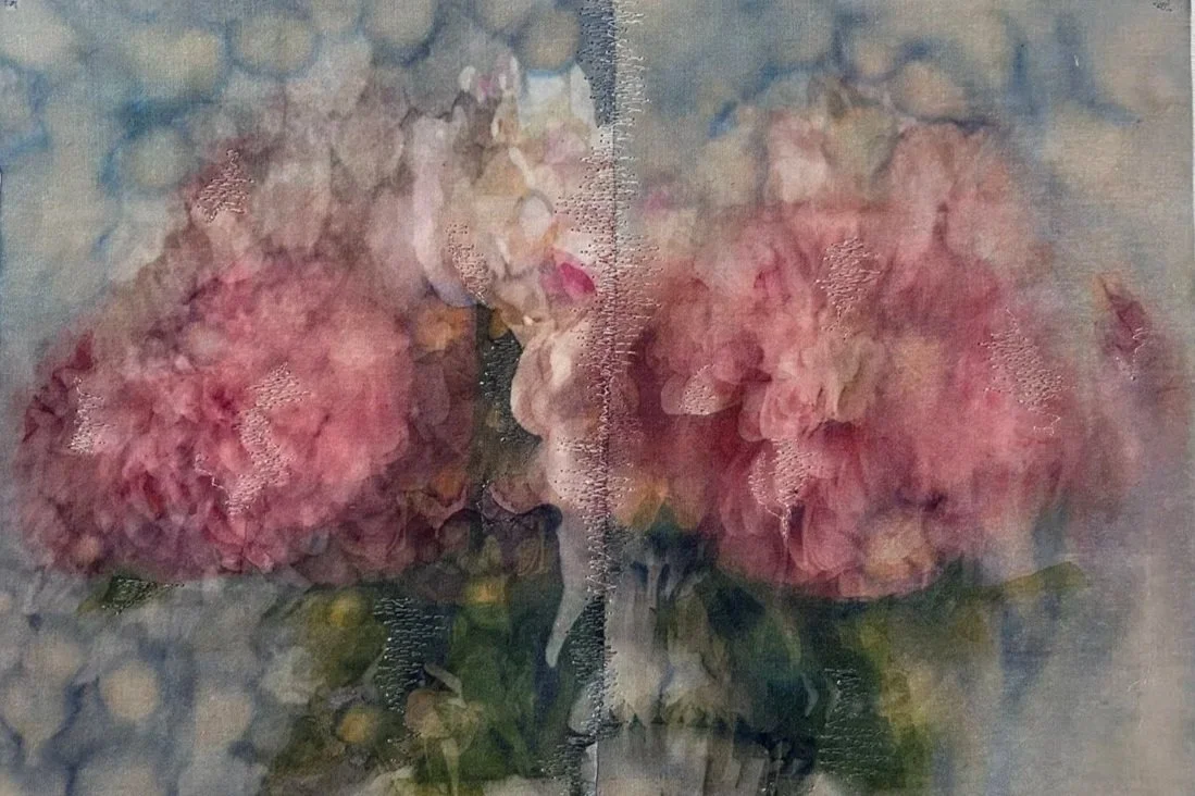 With the series Nothing, forever?, which Michele Landel began in 2021, she explores the lingering presence of someone who is gone and how one processes and captures that specific feeling. She cuts and photographs flowers from her garden that were planted by the previous owner over the nearly sixty years she lived in the house. She prints, paints, and stitches the photographs onto layers of old bed linens that belonged to the previous owner and were given to her by the woman’s children. Though the two women never met, they share the same home and garden. These flowers are intimate but impermanent and fragile connections to the previous owner and the history of the house. When she transfers the images to the bed sheets, the photographs become soft, blurred, and dreamlike, mimicking our memories of those who have left but are still remembered.