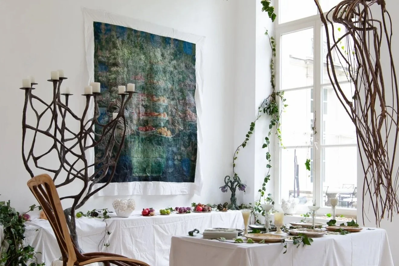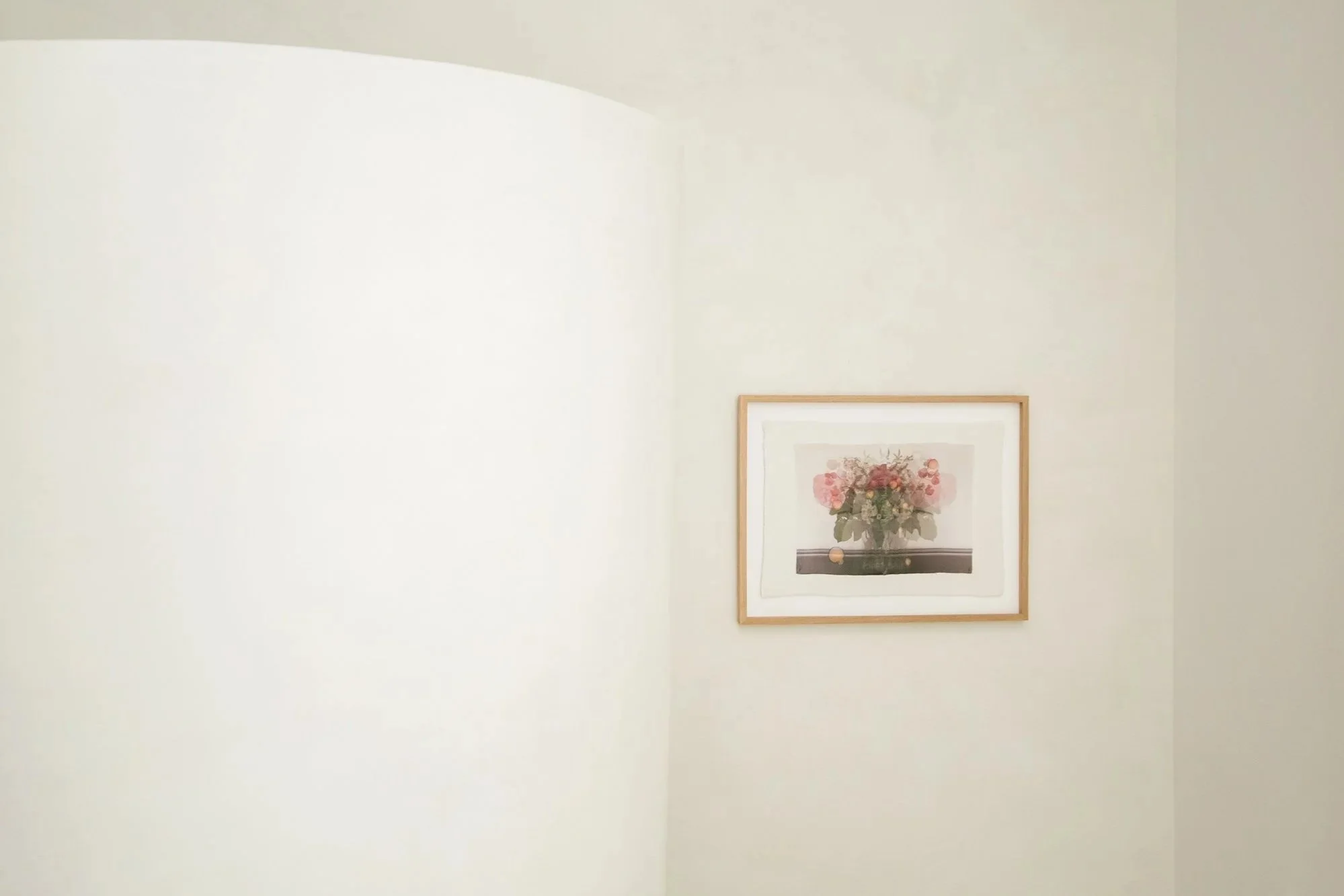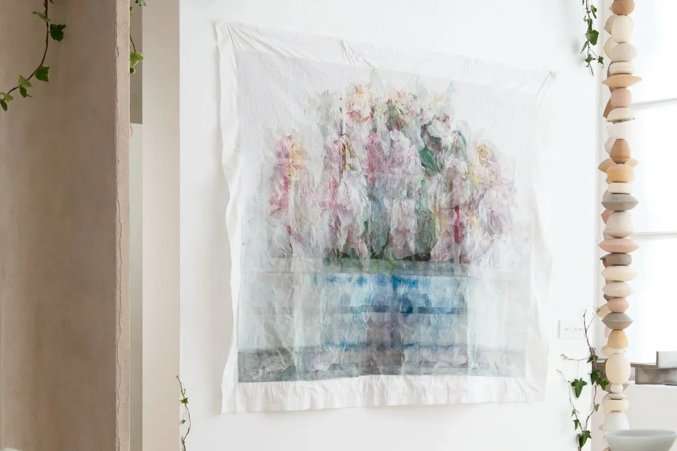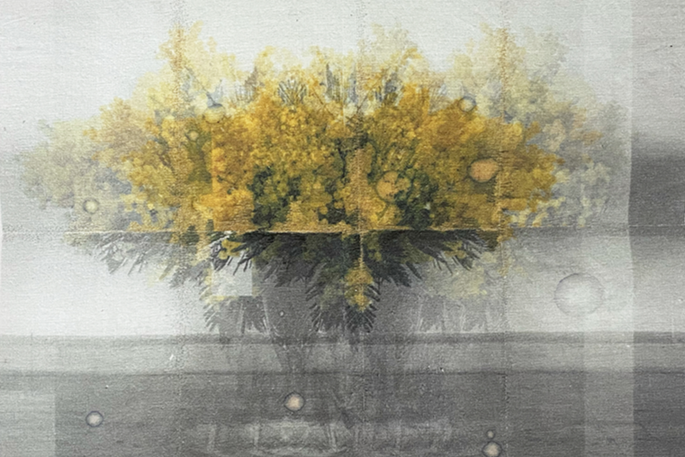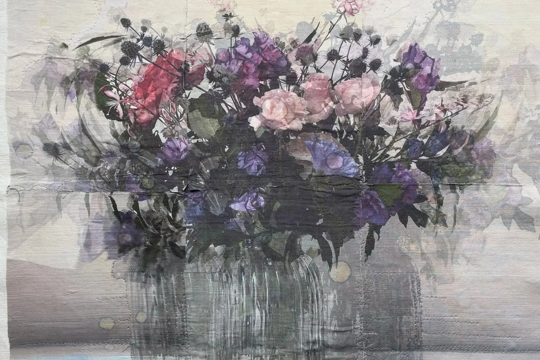 With the series Nothing, forever?, which Michele Landel began in 2021, she explores the lingering presence of someone who is gone and how one processes and captures that specific feeling. She cuts and photographs flowers from her garden that were planted by the previous owner over the nearly sixty years she lived in the house. She prints, paints, and stitches the photographs onto layers of old bed linens that belonged to the previous owner and were given to her by the woman’s children. Though the two women never met, they share the same home and garden. These flowers are intimate but impermanent and fragile connections to the previous owner and the history of the house. When she transfers the images to the bed sheets, the photographs become soft, blurred, and dreamlike, mimicking our memories of those who have left but are still remembered.